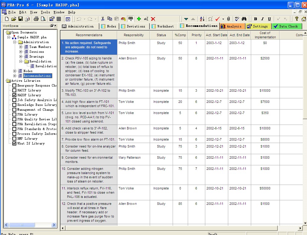 HAZOP是一款世界上销量第一的针对过程危险分析开发的软件, 全世界范围内数以万计公司所采用的标准HAZOP( Hazard and Operability) 工具。它为使用者提供HAZOP、LOPA、SVA 等化工过程危险性分析方法的指导, 不仅使使用者容易上手, 而且为使用者提供了大量较低风险的资讯。应用PHA- Pro 指导安全分析可以进行危险辨识并期望降低危险的发生, 提升分析效率, 因此被广泛地应用于石油化工、国防与航空安全、核电安全、工业安全卫生等行业。